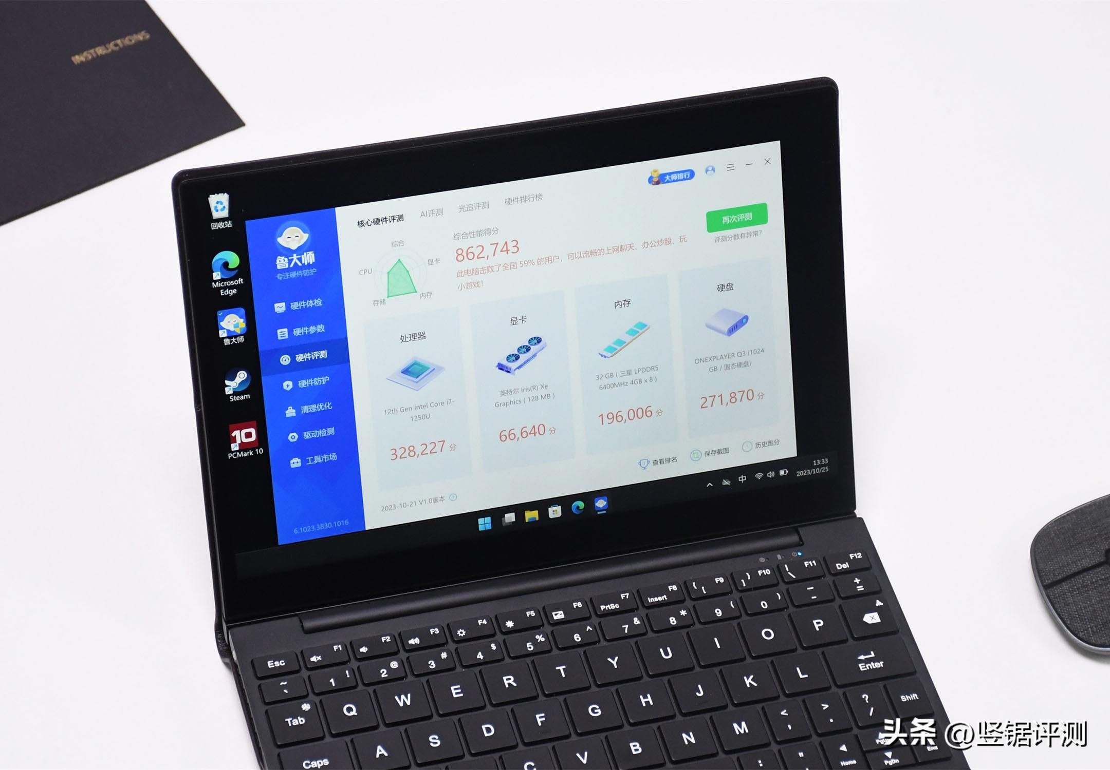 最后该说下性能了,我手上这台壹号本One-Netbook 5搭载了英特尔第12代i7 1250U处理器,锐炬Xe核显(96EU),内存为32GB(LPDDR5),硬盘则为1TB(PCIe4.0),其实单从这些硬件参数上来讲,就足以看出壹号本One-Netbook 5运行各类办公、设计等软件没什么压力,在鲁大师的性能测试下,可以看到成绩为862743分,显卡分数低了点。
