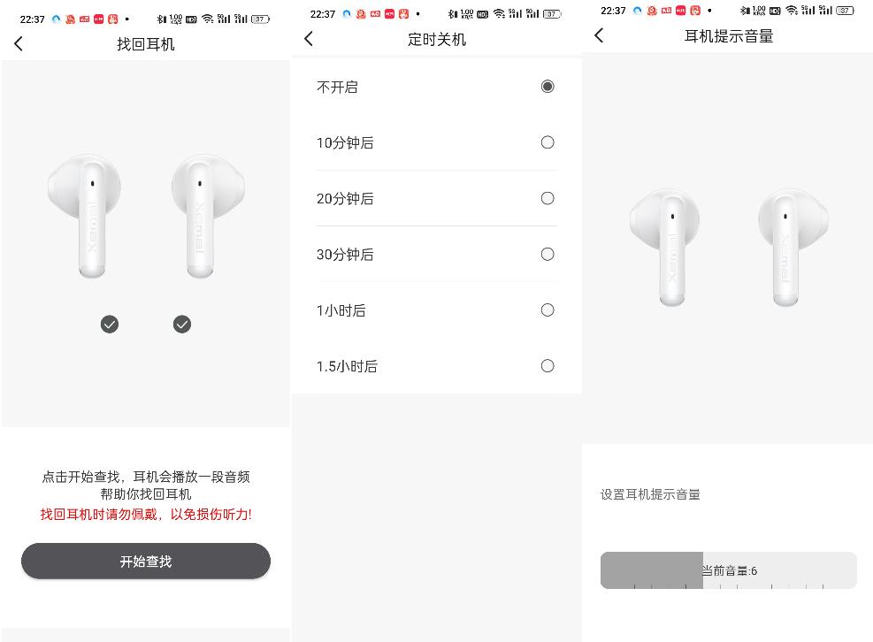 找不到耳机的时候可以APP里的定位找回耳机功能,耳机会用最大声音播放音频。另外对于戴耳机睡觉的我来说,定时关机功能真的是非常实用,不用再戴一整晚把电耗干了。除此之外,耳机的提示音也是可以调节音量的调最低相当于关了,适合不喜欢提示音的朋友。