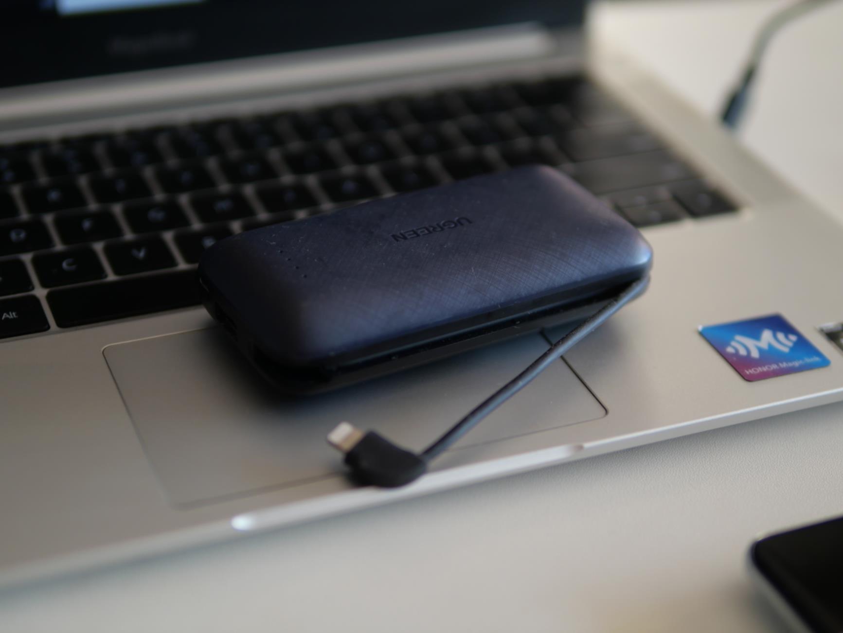 苹果的充电线是埋藏在充电宝内的,如果是苹果用户可以不用带线了,我作为安卓用户还是需要额外的线的。10000mAh的容量,体积上表现不错,看起来就像是一块肥皂,重量表现也可以,我平时背小包出门,它也不算是一个很大的负担。