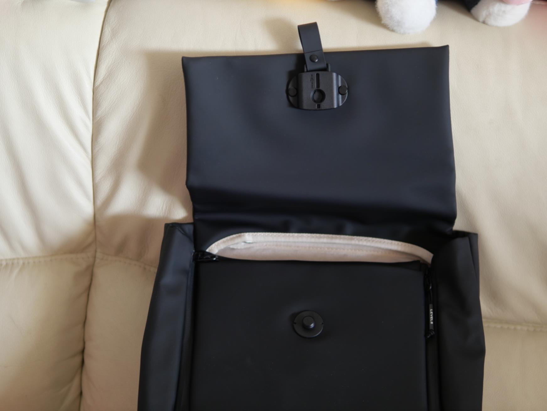 这款包的特点就是非常耐用,表层材料使用的环保素皮,触感亲肤,外表面料耐刮耐折,可以达到4-5级防水,平时下个小雨什么都没问题,而且抗油污、好打理,脏了直接用湿毛巾擦一下就可以了。包的盖子是德国fidlock磁吸卡扣式的,正常怎么拽都拉不开,但是需要打开的时候往下一拉轻轻一抬,包就开了。