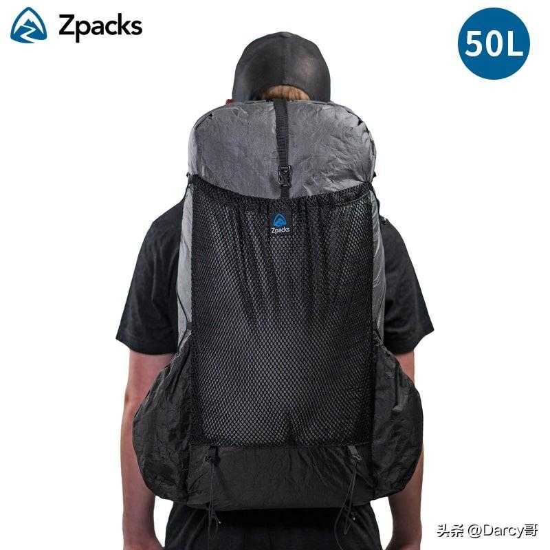选用DSM Dyneema复合面料(原 Cuben Fiber)制成具有轻量、防泼水和抗撕裂性能打开扣具可直通背包内部,2个侧袋。
