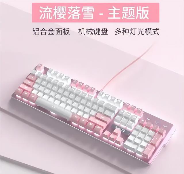 本手机械键盘,外观主要是粉色可爱主题风格为主,比较的适合一些女生们去使用哦。有白色的背光,动态光效,金属面板设计。机械轴体开关,在三种可以去选择,每一种都有各自特别,如果你是一个办公室女白领,推荐你去使用机械红轴,直上直下,声音比较的小,而且压力小。有22种灯光的效果,可以让你进行自由的切换。
