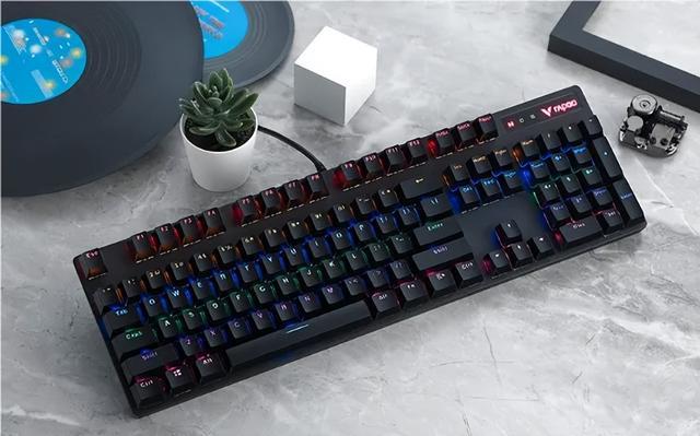 雷柏(Rapoo) V500PRO 背光机械键盘,设计有混彩的背光系统,里面有5种灯光的模式。一共有4种机械轴可以去供你选择,分别是黑轴、青轴、茶轴、红轴这几种轴可以去供你去选择。磨砂的金属上盖,好质感。104键全尺寸的按键布局,全键无冲突。还带有防溅洒水设计,在键盘的背面设有4个疏水孔,如果一不小心把水洒到键盘当中,也能够正常工作。