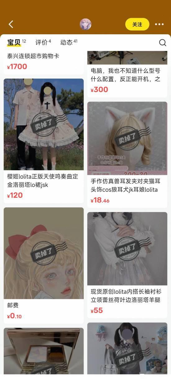 “楼主晒了卖家的闲鱼主页,里面卖了一堆衣服、化妆品、配饰…