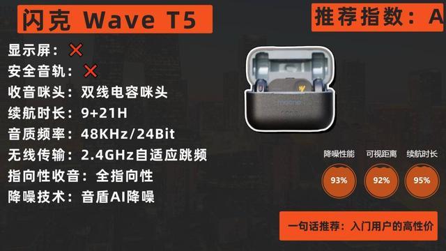 闪克Wave T5定位于需要应对多变环境与追求音质上限的进阶创作者。其 “音盾”AI降噪系统的灵活性令人印象深刻,允许用户为不同创作(如严肃访谈、沉浸式Vlog、户外运动)保存不同的降噪配置文件。硬件上,它采用全指向拾音设计,配合高规格采样率,声音还原自然。 2.4GHz自适应跳频技术提供了远超日常需求的300米传输保障。轻至9克的发射器是长时间佩戴的福音,而充电盒带来的30小时总续航更是为全天乃至多日拍摄打下了坚实基础。然而,作为一款主打高规格和智能化的产品,其定价处于中高端区间,对于预算非常有限或仅需基础收音功能的入门用户来说,性价比可能不是最优选。