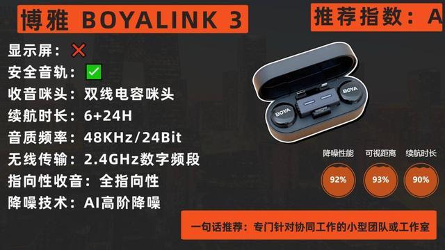 博雅BOYALINK 3是一款为追求音质与传输距离的创作者设计的均衡之作。它在关键的音频链路上均采用了高规格配置:48kHz/24Bit的录音格式、85dB的信噪比以及AI智能降噪处理。其无线性能尤为突出,2.4GHz数字频段实现了300米的远距离稳定连接,突破了大多数拍摄的半径限制。设备支持一拖二立体声录制,并标配安全音轨,功能全面。 9克的极轻发射器重量和磁吸设计,确保了佩戴的舒适性与隐蔽性。配合智能充电盒,总续航可达30小时。缺点在于,其降噪功能虽然强大,但用户无法通过硬件按键快速开关或切换降噪档位,必须通过手机APP进行设置,在快节奏拍摄中不够便捷。