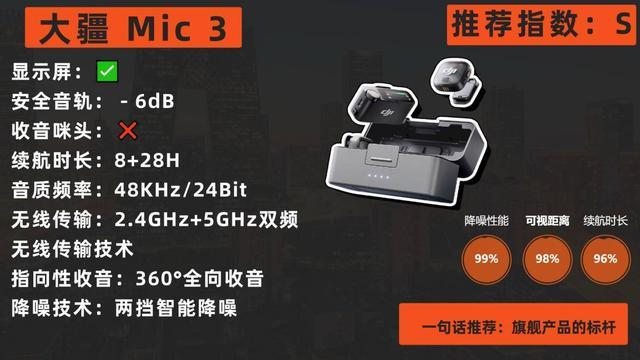 大疆Mic 3是一款重新定义“可靠”二字的无线麦克风。它的可靠性体现在三个方面:连接可靠(双频400米传输)、音质可靠(130dB声压级,-6dB安全音轨)和电力可靠(28小时总续航)。其智能降噪算法能有效过滤环境中的稳态噪音,且不对人声产生明显压缩感。接收器的彩色显示屏提供了媲美专业录音机的视觉反馈。无论是单人创作还是双人访谈,它都能提供稳定、清晰、安全的音频解决方案。作为一款集大成的产品,其价格自然定位高端,主要面向对音质和可靠性有极致要求的专业用户或资深爱好者。