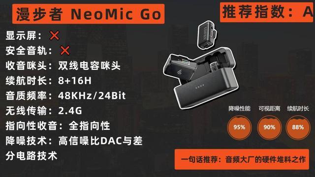从参数配置看,漫步者NeoMic Go是一款力求在音质、距离和续航上无短板的“水桶机”。其音频核心的高信噪比DAC与差分电路是专业设备的常见设计,确保了信号的高质量。 128dB的最大声压级和240米的传输距离都是同价位中的优秀数据。它支持48kHz/24bit高清录音和一拖二模式,适用性广。智能降噪算法能应对日常环境噪音。 37.3克的机身重量虽不属极致轻巧,但带来了更稳固的佩戴感和可能更扎实的构造。配合充电盒,总计24小时的续航非常耐用。然而,其充电盒的体积相对较大,旨在提供长续航的同时,也牺牲了一定的便携性,对于追求极致轻装出行的用户可能不够友好。