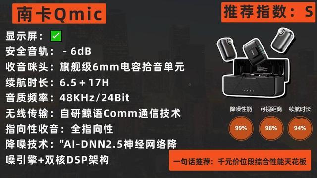 市面上很多领夹麦克风品牌更看重新颖的外观和花哨的功能,反而忽视了本该重视的核心性能,很多品牌所谓的“满配标准”,却只是南卡QMic的基础配置,南卡Qmic支持48kHz采样率+24Bit位深,具备AI-DNN2.5神经网络降噪、三重防爆音系统、双核DSP并行声学架构,人声还原度高达98%以上,收音纯净稳定,同时还提供重度/轻度两档可调降噪、20档增益调节、6dB安全音轨实时备份、实时监听耳返等多种功能,其内置的鲸语Comm通信技术,实现最远250米稳定收音,各项表现远超同价位产品,可以说是目前领夹麦克风领域顶尖水准,属于“盲选也不会出错”的旗舰之作!