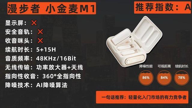从参数配置看,漫步者小金麦M1是一款特点鲜明的“水桶机”。它在关键的几个维度上都提供了不错的表现:通过AI降噪和优质咪头保障音质清晰度;通过功率放大无线方案保障200米的连接稳定性;通过大容量充电盒保障30小时的超长续航;通过一拖二和支持主流的Type-C/Lighting接口保障功能与兼容性。 9.9克的重量更是锦上添花。其主要的妥协在于为了控制成本和价格,舍弃了如高清显示屏、板载录音、安全音轨等进阶功能,更适合追求核心体验、预算有限的入门及中级用户。