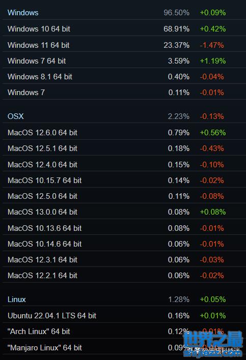 操作系统方面则有意思了,不出意料的是,OSX系统的份额只有可怜的2.23%,而且比之前还下滑了一点,只是比Linux好一点。简而言之,M1芯片并不能拯救MacBook的游戏生态——至少在Steam平台是这样。