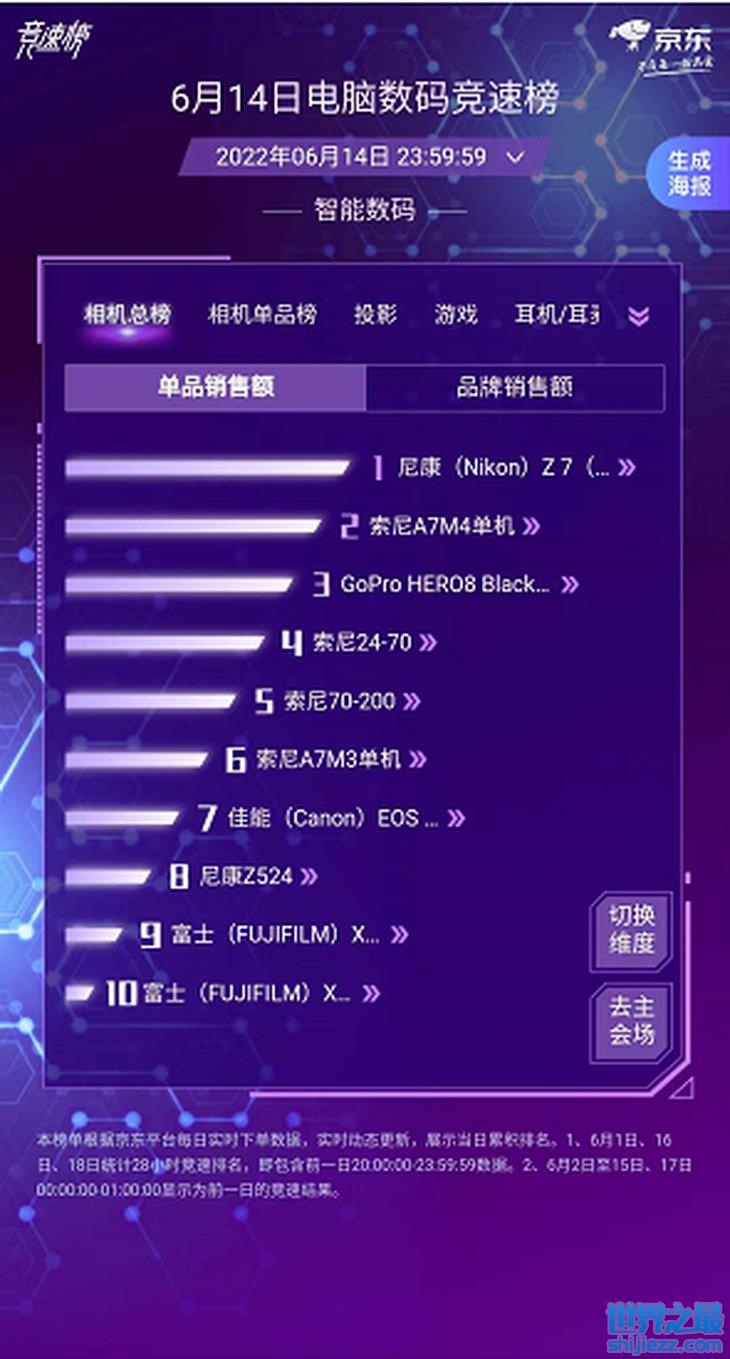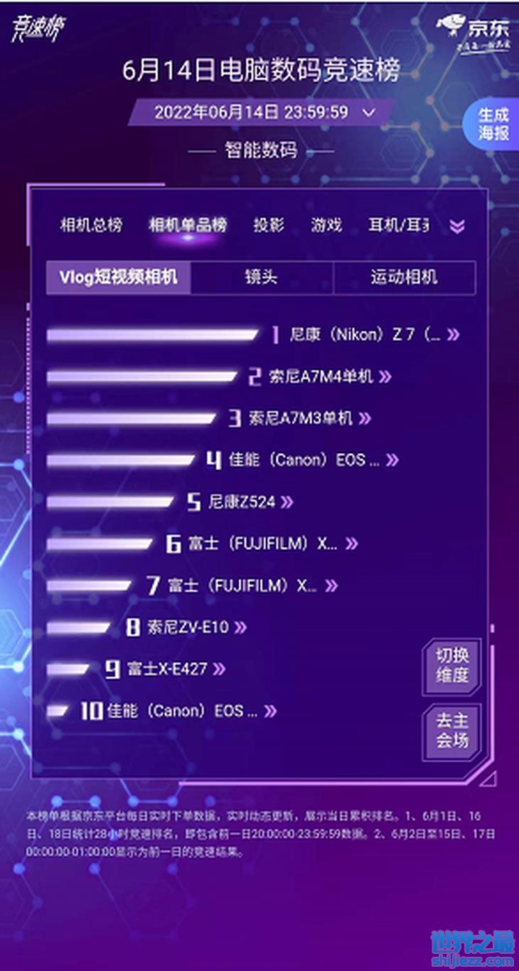 相机方面,截至6月14日23:59,尼康Z7、索尼A7M4单机、GoPro HERO8 Black运动相机获得了相机总榜单品销售额榜TOP3;而在Vlog短视频相机榜单中,尼康Z7同样获得了榜单冠军,索尼A7M4单机、索尼A7M3单机则分列第二、第三名。