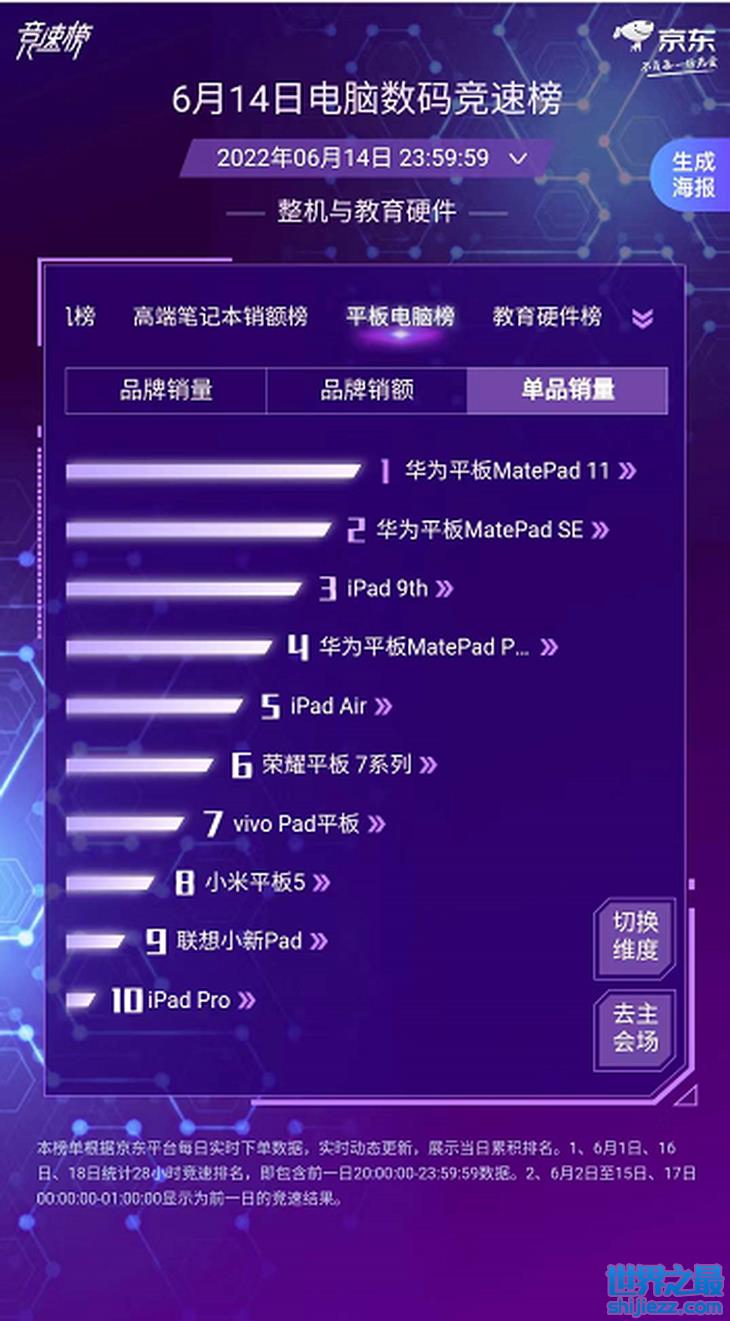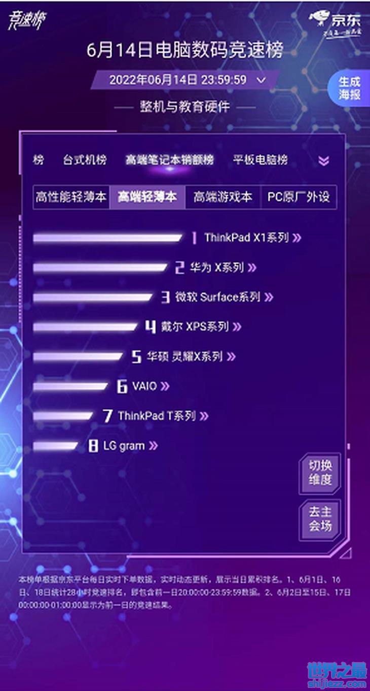 截至6月14日23:59,联想斩获了笔记本销量总榜冠军,华为、华硕、戴尔、ThinkPad紧跟随后。高端笔记本方面,ThinkPad X1系列凭借出色的性能优势和品牌号召力,斩获了高端轻薄本销额冠军,华为X系列、微软Surface则分列第二、第三名。平板电脑榜方面,华为平板MatePad 11斩获单品销量冠军,华为平板MatePad SE、iPad 9th则分别获得了平板电脑单品销量第二、第三名。