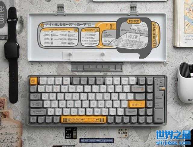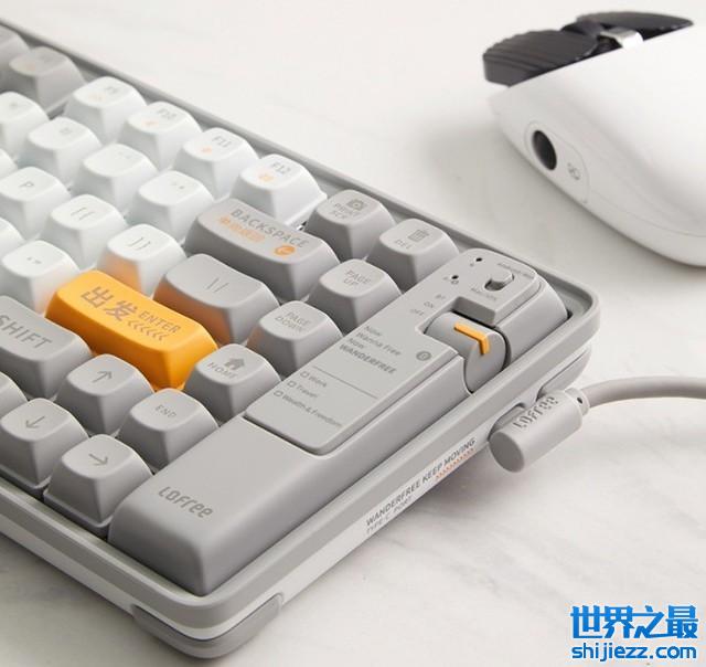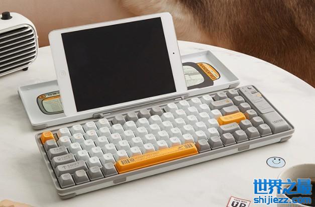 这款键盘是笔者自己比较中意的一款产品,采用了一个84键的布局,紧凑节省空间的同时,满足日常输入需要。用户可以根据自己的需要选择有线、无线的连接方式。它的整个配色是比较吸引人的,象牙白、橘黄、浅灰的键帽搭配起来非常舒服。值得一提的是,它还标配了一个磁吸前盖,不仅可以支撑手机和iPAD等设备,而且也可以完全扣上,键盘瞬间化身成一个小箱子,既防尘又便携。采用GRTERON茶轴轴体,适合文字输入,4000毫安时电池容量续航有保证。