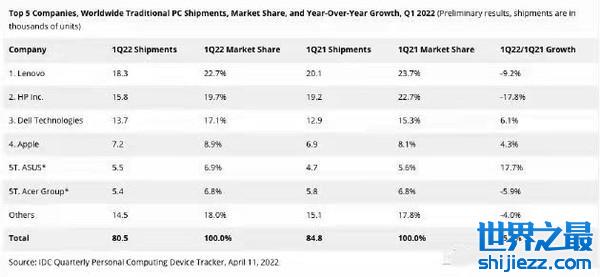 2022年Q1全球个人电脑市场排名(图源IDC)