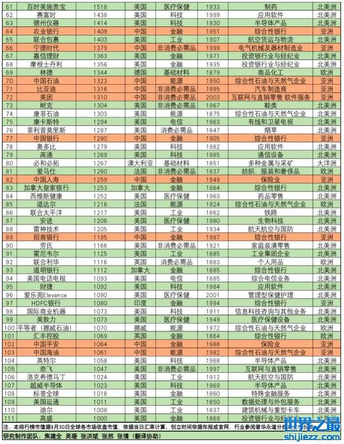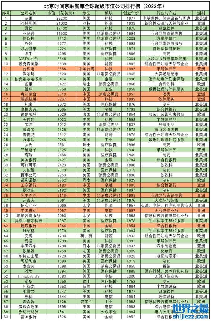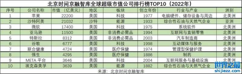 近日,北京时间京融智库发布2022年全球超级市值公司排行榜,以2022年9月30日收盘数据计算,全球市值超过1000亿美元以上的超级市值公司共有111家。
