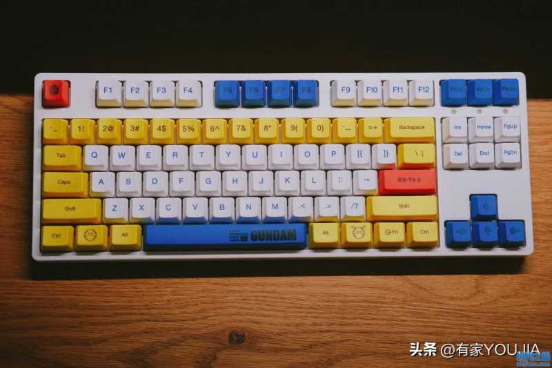 目前在用的键盘是ikbc高达联名机械键盘,外观非常硬朗,据说设计灵感源自阿姆罗驾驶的RX-78-2机体的头像元素,红蓝白简约配色,非常耐看。