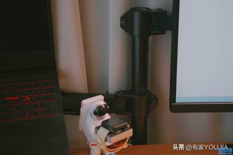 电脑支架最后选择了悬空式,显示器和电脑都可以悬空,底部空间还能利用起来,支架做工还可以,非常厚重,可以同时放一台显示器和笔记本,非常稳,不会晃动,同时还能调节高度。