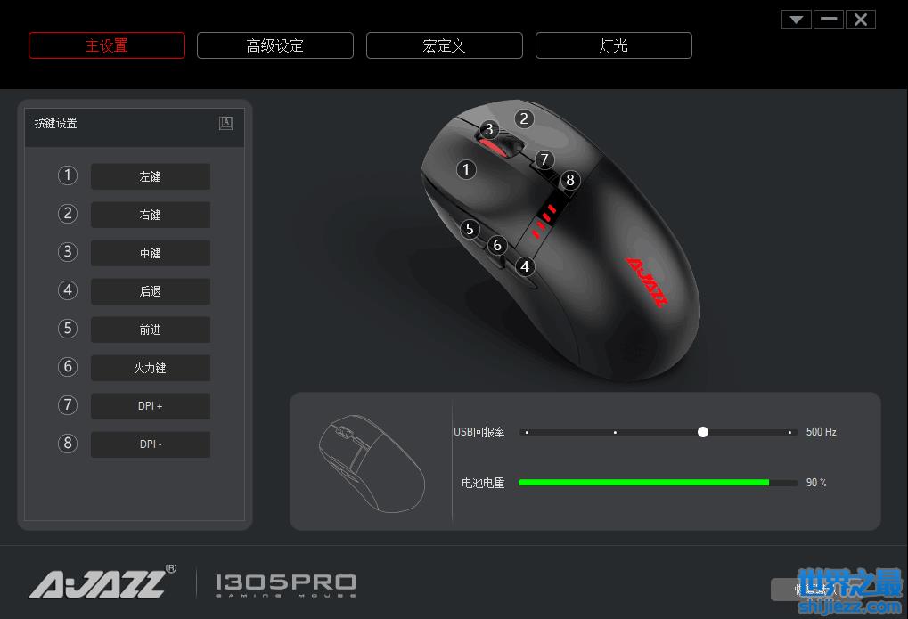 ▲黑爵鼠标可以用驱动来实现更多的功能;驱动主界面可以看到主设置,对8个按键逐一设置成自己的习惯,我一般都喜欢用默认设置。(该界面还可以看到鼠标电池电量)