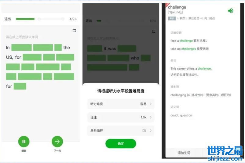 它支持精听功能,可以设置听力难度、语速和单句循环次数,对某个英语句子采用挖空的形式,需要根据句子的完整发音在纸上写出缺失的单词。