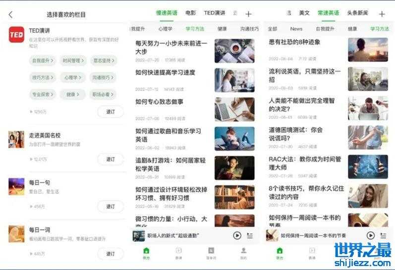 每个分类包括多个具体分类,例如慢速英语分类包括:自我提升、心理学、学习方法、沟通技巧、思维方式等。