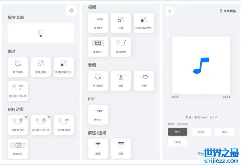 它支持的功能包括:图片格式转换、图片压缩缩放、图片压缩到指定大小、实况照片转 MP4 、视频转 GIF 、实况照片转 GIF 、GIF 转 MP4 、GIF 提取图片、视频转 MP4 、视频压缩、视频压缩到指定大小、视频提取图片、视频提取音频、音频格式转换、音频裁剪、音频连接、图片转 PDF 、Word 转 PDF 、Excel 转 PDF 、PPT 转 PDF 、文件解压、文件压缩。