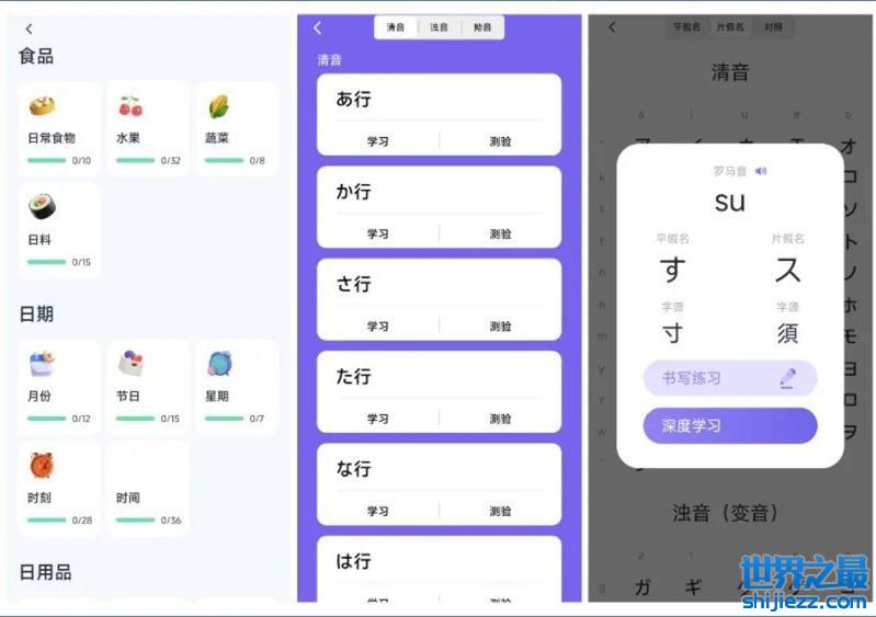 它免费好用,支持的功能包括:50 音基础学习、专项测试、专业发音、动图笔顺、50 音视频讲解、学习卡片、假名专项复习。