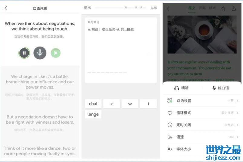它不仅提供英语原文,也提供英语听力,支持点击任意单词发音,支持双语设置、盲听模式、循环模式、定时关闭,支持设置语速、字体大小。