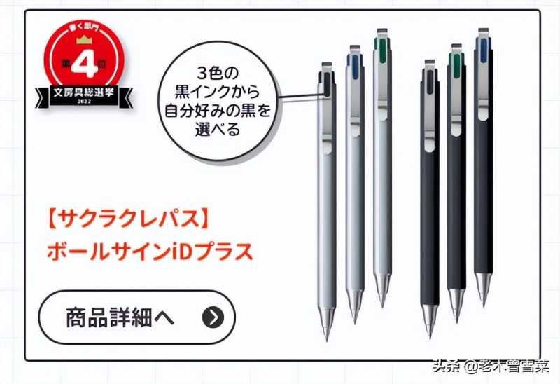 非plus版国内俗称樱花波西,plus版本是去年全新推出的中性笔,它提供纯黑、深蓝、深绿三个黑调笔芯,颜色浓郁,都可以作为学生的日用中性笔。磨砂笔杆和低重心笔头的搭配十分到位,整体外观商务时尚,价格也依旧属于大众向产品,想要一支高品质按动中性笔的核心选择!