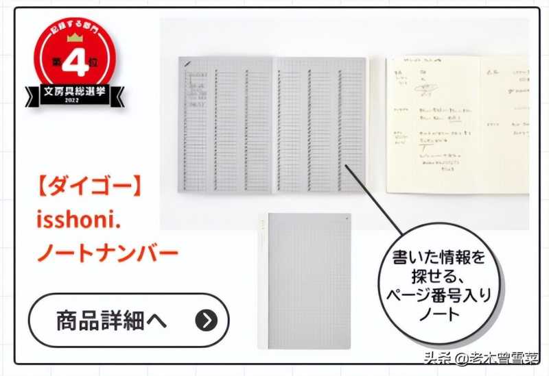 isshoni系列是日本著名的办公纸质用品,这款的特点是扉页制作了目录榄,专为大家作为会议前使用,可以提前编辑目录,再到对应的页码写下内容,使每本笔记本更好索引,本子本身的纸质。页码是斜角设计,支持横竖两用,天猫有售,价格不太美好,设计相当有趣。