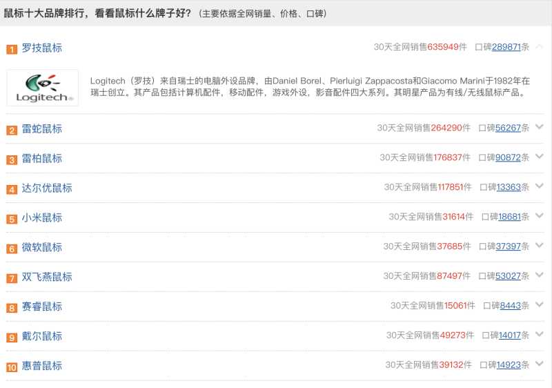 作为电脑的最为在意的外设,键盘和鼠标自然是大家选购时的大头,一款好的鼠标也是大家使用电脑时可以改变使用体验的产品,那么针对选购鼠标时,我们应该选择什么品牌更好。这里也是根据慢慢买近一个月的数据,为大家整理出了最新的十大鼠标品牌,以及主流品牌下有哪些值得选到型号。