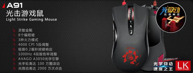 血手幽灵A91光微动游戏鼠标使用USB接头与设备连接,鼠标连接线的线长为180cm,基本上可以满足玩家的使用需求。鼠标使用了红黑两色的尼龙编织表面,抗弯折能力以及韧性都非常的出色。鼠标采用了安华高A3050的游戏光学引擎,并且支持1000Hz四段USB报告率调整。