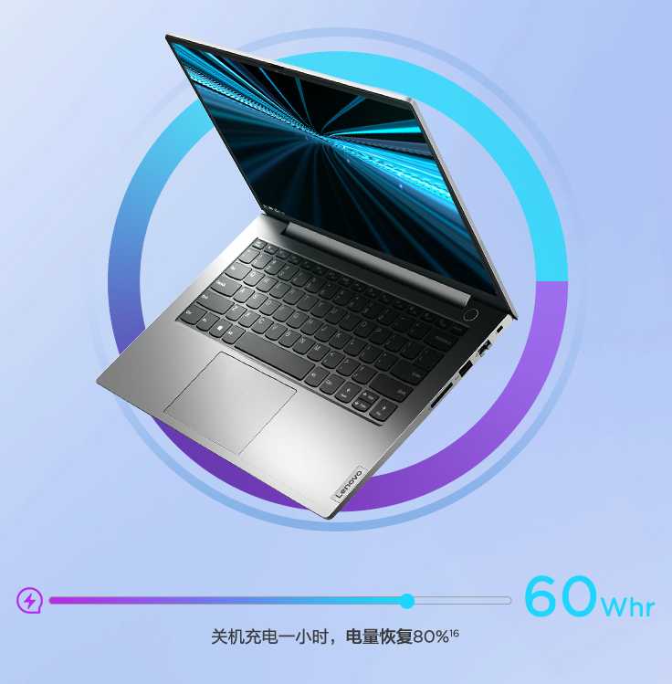 在整机续航方面,ThinkBook14 2021系列配置了60Whr的超大容量电池,最高能提供8小时的使用时间,同时全功能Type-C接口支持快充模式,充电一小时即可恢复80%电量,告别低电量焦虑。