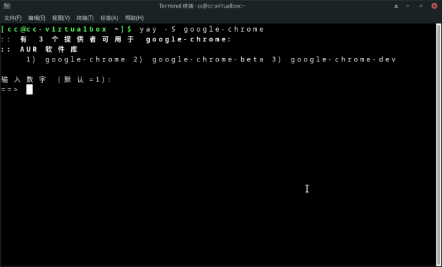 打开终端,然后再输入“yay -S google-chrome”即可完成Chrome的下载、安装。