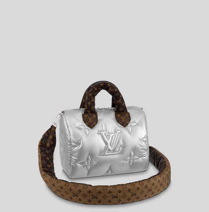 路易威登SPEEDY BANDOULI?RE 25 手袋有海军蓝和银色两款。回收衬垫锦纶释放莹亮光泽,搭配 Monogram 刺绣图案与 Mini Monogram 帆布饰边。顶部手柄与肩带均采用衬垫设计,令背携更为柔暖舒适。着实体现了设计师为使用者的实用性的用心良苦,设计理念和专业细节为品牌经典构型注入炫酷态度,不冲一波似乎都说不过去。