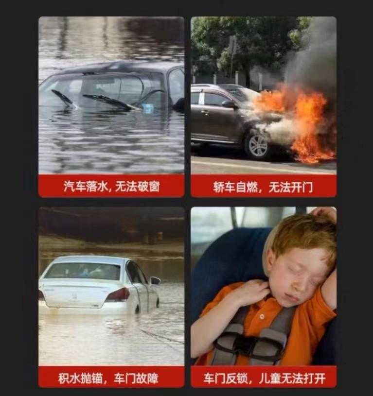 据统计,在落水事故和交通事故中,由于压强和车身变形,车门很难打开。玻璃成了我们逃生的唯一窗口。车载安全锤子能够很好解决这个问题,破窗靠的就是尖锐物。科技含量不高,