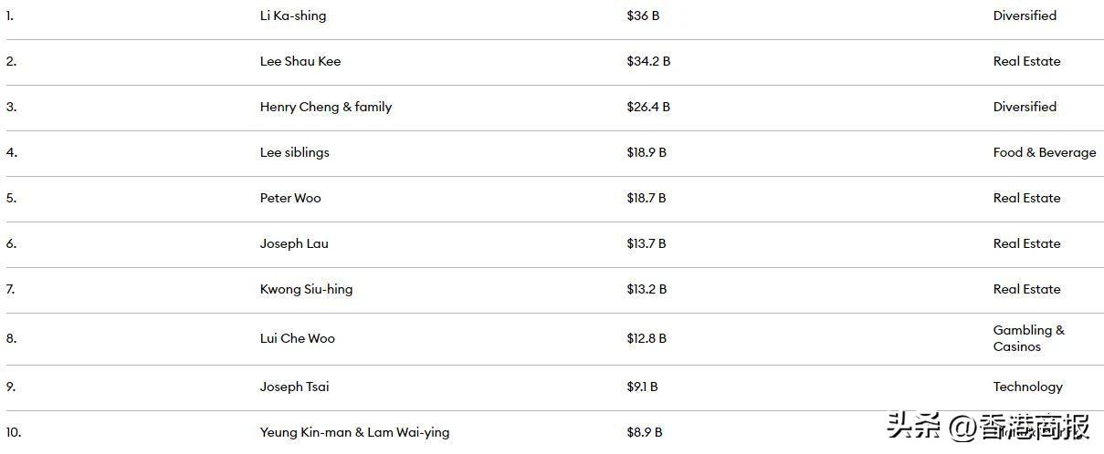 第四位是李锦记李氏家族,第五位是九仓高级顾问吴光正,第六位是新鸿基地产创办人郭得胜夫人邝肖卿,第七位是银河娱乐董事长吕志和,第八位是华置前主席﹑人称“大刘”的刘銮雄,第九位是阿里巴巴创办人之一的蔡崇信,第十位是“玩具大王”蔡志明。