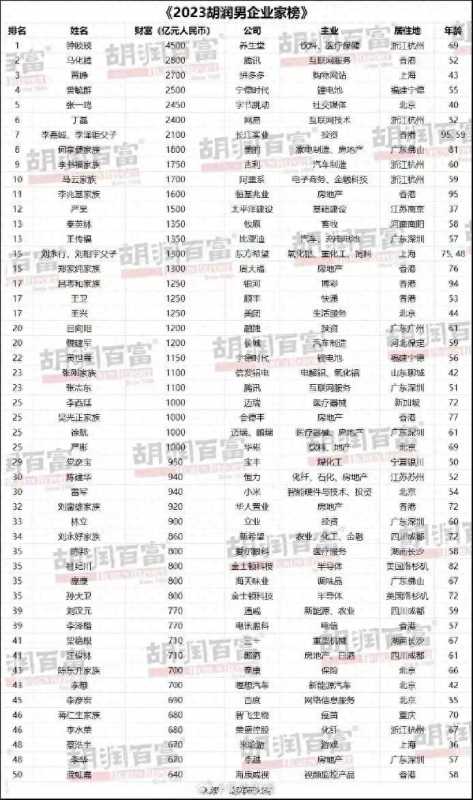 鞭牛士 12月12日消息,今日,胡润研究所发布《2023胡润男企业家榜》,列出了今年胡润百富榜中的前50名男性企业家,总财富6.37万亿元。