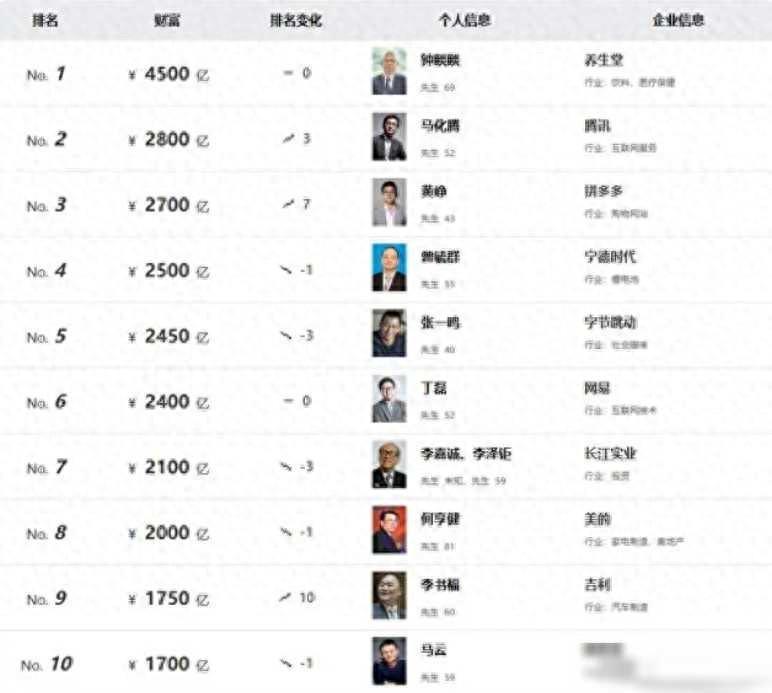 首先,让我们来看看双马的变化。去年还排在第四位的马化腾,竟然在短短一年间跻身第二,财富高达2800亿!而原本风光无限的马云,却意外地滑落至第十名。这个颠覆性的变化让人不得不感叹,商场如战场,一夜之间可能就会出现逆袭的英雄,也可能会有英雄落魄的时刻。