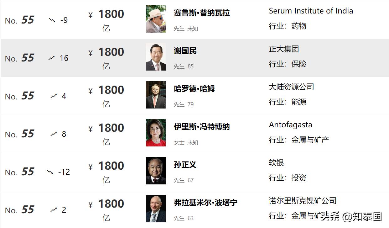据悉,在该富豪榜百大排名中,84岁的泰国正大集团董事长谢国民以1800亿元的身价排名第55位,是泰国唯一一位排名在前100的企业家,排名上升16位。