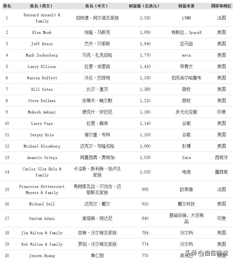 全球富豪榜TOP20中,14名美国人上榜,法国和印度各2人上榜,西班牙和墨西哥各一人上榜!