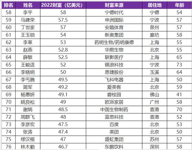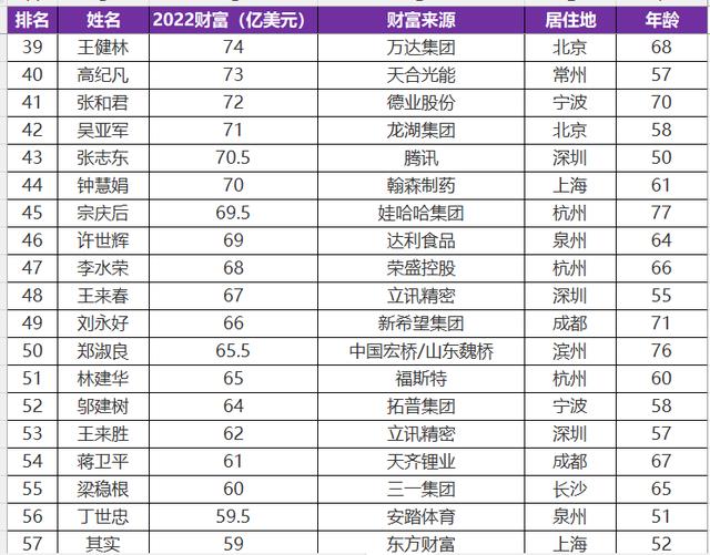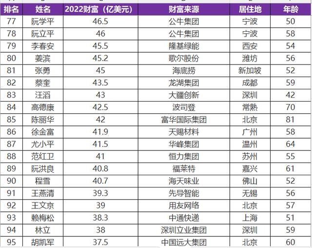2022年福布斯中国内地富豪榜第三名还是曾毓群,这几年新能源行业是蓬勃发展,让宁德时代赚得盆满钵满,曾毓群的财富排名依然维持在第三。