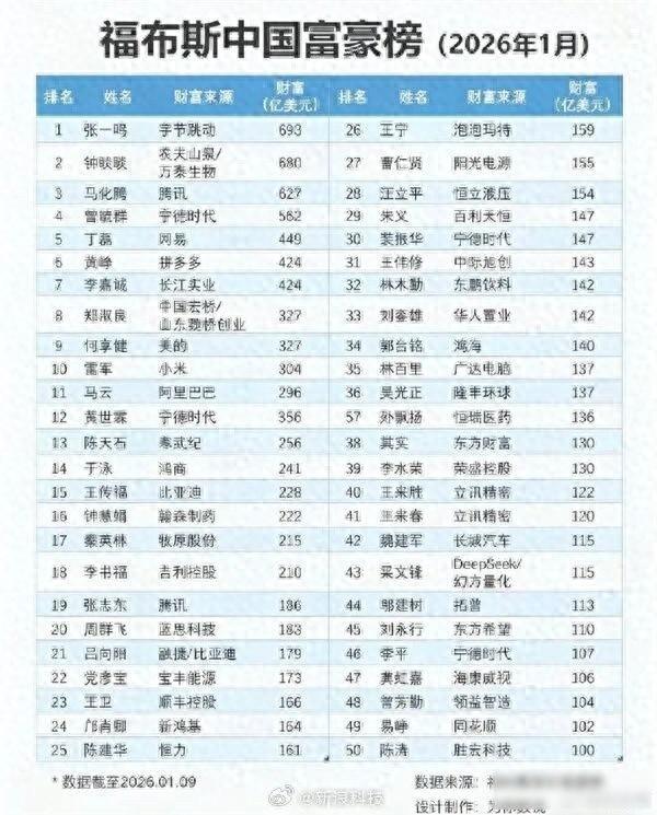 福布斯中国富豪榜50强,宁德时代占4个,如果华为上市会占几个? 2026年1月份福布斯中国富豪榜公布,毫无悬念,前三甲被字节、农夫、腾讯给霸榜:字节跳动创始人张一鸣以693亿美元的身价排名第一,可以说是当之无愧;农夫山泉老板钟睒睒以680亿美元排名第二;腾讯老板马化腾以627亿 ... 富豪02-04