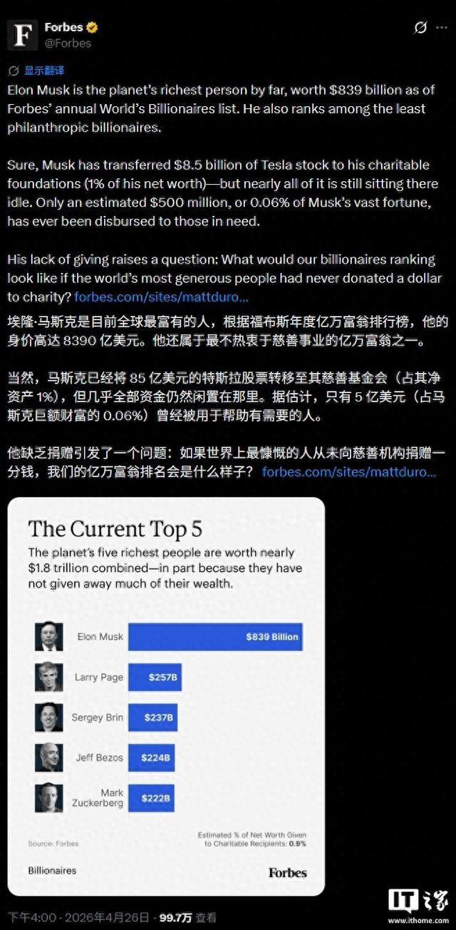 IT之家 4 月 28 日消息,福布斯杂志 4 月 26 日发文称,埃隆 · 马斯克是目前全球最富有的人,根据福布斯年度亿万富翁排行榜,他的身价高达 8390 亿美元(IT之家注:现汇率约合 5.73 万亿元人民币)。
