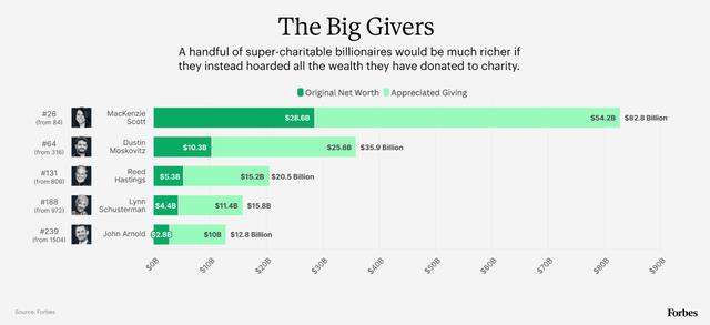 福布斯还列出了热衷于慈善的亿万富翁,包括贝索斯的前妻麦肯齐 · 斯科特、Facebook 创始人之一达斯汀 · 莫斯科维茨、Netflix 创办人里德 · 哈斯廷斯等。