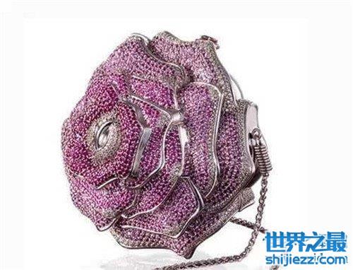 这款包包不仅仅是简单的一个玫瑰花图案的包包,而是用金属打造出了一个玫瑰花样的包包,在玫瑰花的每一个花瓣上面都用了很多的紫色钻石来点缀,让人一眼就可以看出这个包包的与众不同之处。是全球十大最贵女包上面镶嵌钻石最多的一款包包。