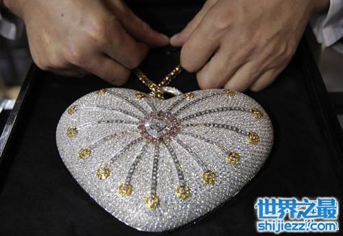 这个钻石包整个包身全部是由钻石包裹的,用了上千个白钻点缀出了一款非常昂贵的钻石包,同时也用了一些黄钻和粉钻,这样也不会显得整个钻石包非常的单调,同时也不会给人一种钻石过多的反感。并且这个包包的链子是由纯黄金制成的,它的价格自然是非常昂贵的了。