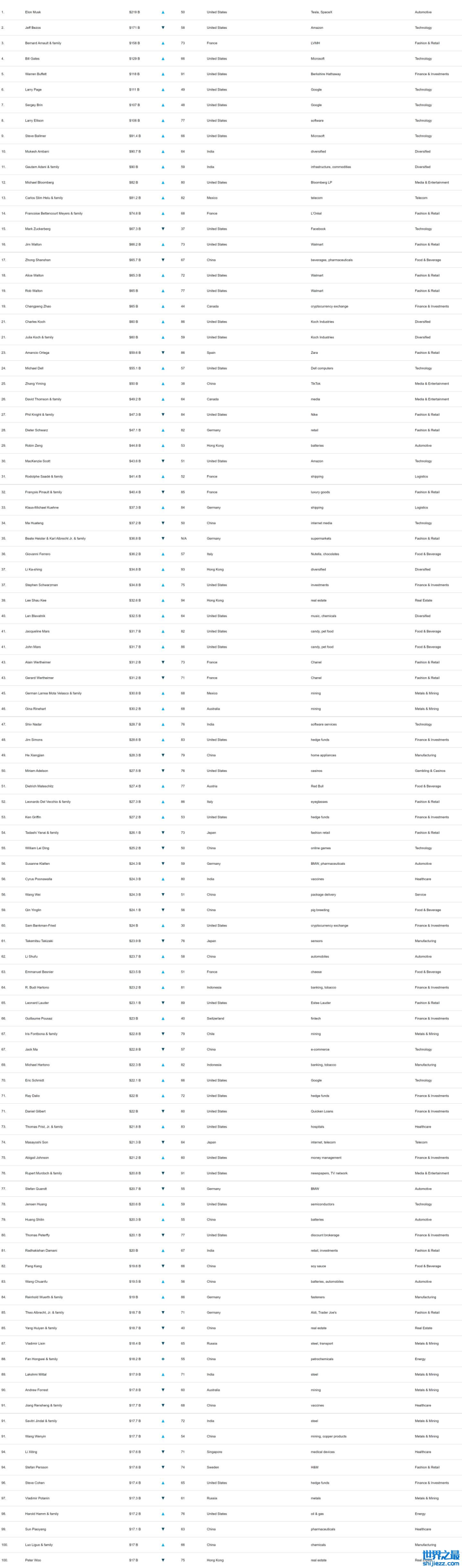 IT之家了解到,其中,特斯拉、SpaceX CEO 埃隆・马斯克(Elon Musk)以 2190 亿美元(约 1.4 万亿元人民币)的财富位居富豪榜第一位。