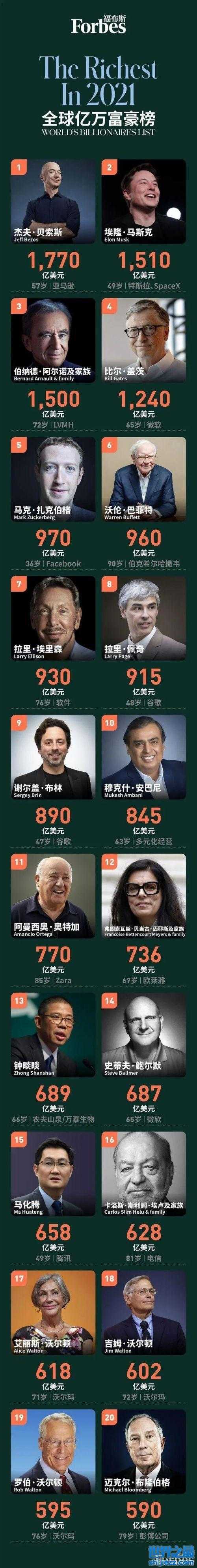 福布斯2021全球亿万富豪榜发布 全球TOP20位顶级富豪名单