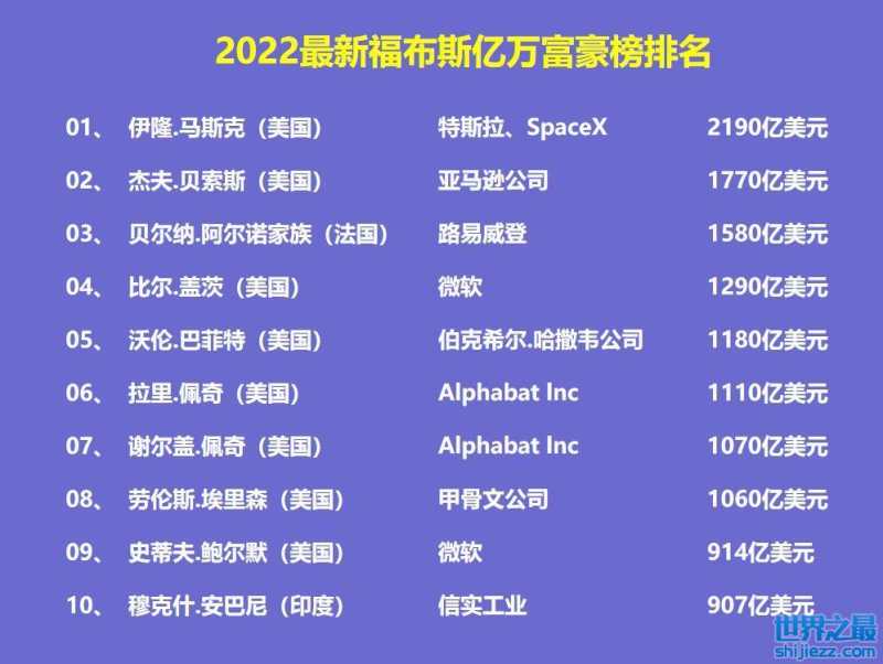 2022最新福布斯亿万富豪榜前十排名